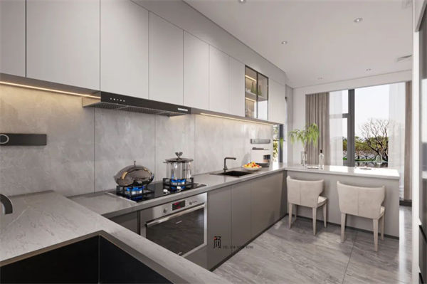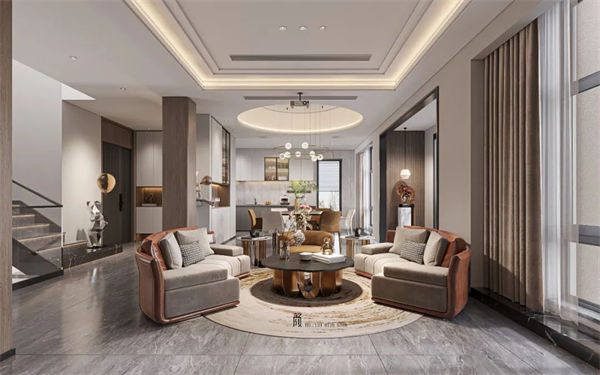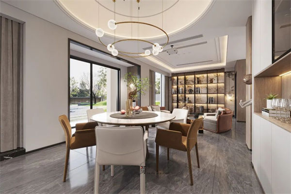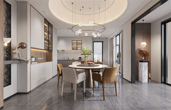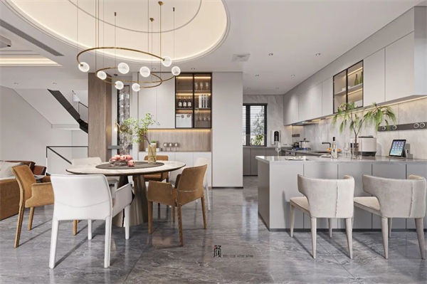 以米白、大地色為基調(diào),搭配淺色系的裝飾,在低調(diào)中盡顯奢華,櫥柜尾部設(shè)計(jì)了一個(gè)休閑區(qū),正對(duì)前面的落地窗,在細(xì)節(jié)里透露著對(duì)生活的精致。不同材質(zhì)的紋理和色彩相互融合且對(duì)比,增強(qiáng)了空間畫面感,蜿蜒靈動(dòng)的弧形吊頂豐富空間的層次,令人完全放松下來并享受充滿濃烈的家庭氛圍中