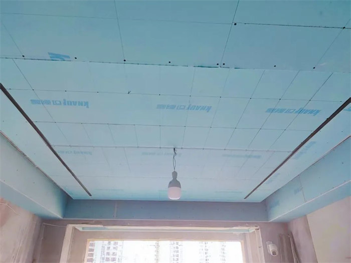 △吊頂平梁,梁下過一層石膏板,厚度10mm,縫隙用發(fā)泡膠軟連接,