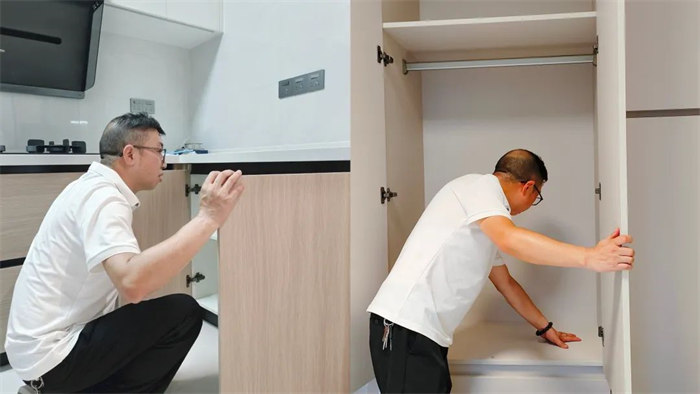 △我們的監(jiān)理正在對屋內(nèi)的定制櫥柜、衣柜進(jìn)行檢查,確認(rèn)柜體是否水平垂直,