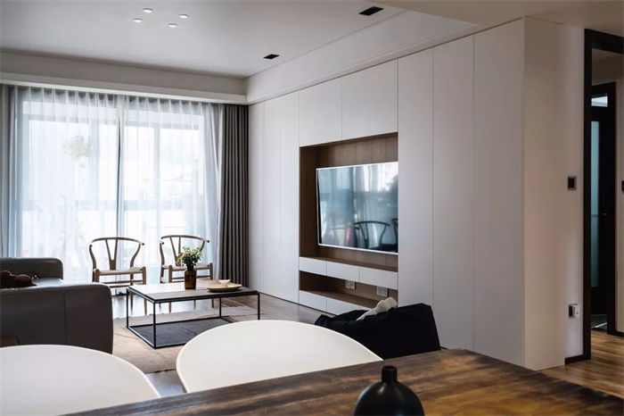 ▲入墻式的電視墻,把電視墻裝成收納柜,同時(shí)中間留出了電視機(jī)的孔位,