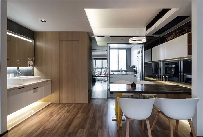 ▲餐廳一側(cè)就是洗手盆,側(cè)邊的木飾面打造的墻體裝上一個(gè)隱形門(mén),潔凈的洗手盆結(jié)合木質(zhì)感的空間,