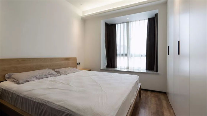 ▲主臥空間擺上一張木質(zhì)床與2個(gè)床頭柜,飄窗上裝著一個(gè)擋光窗簾,床尾的衣柜簡(jiǎn)潔通頂,把整個(gè)空間都裝扮得格外的舒適時(shí)尚。