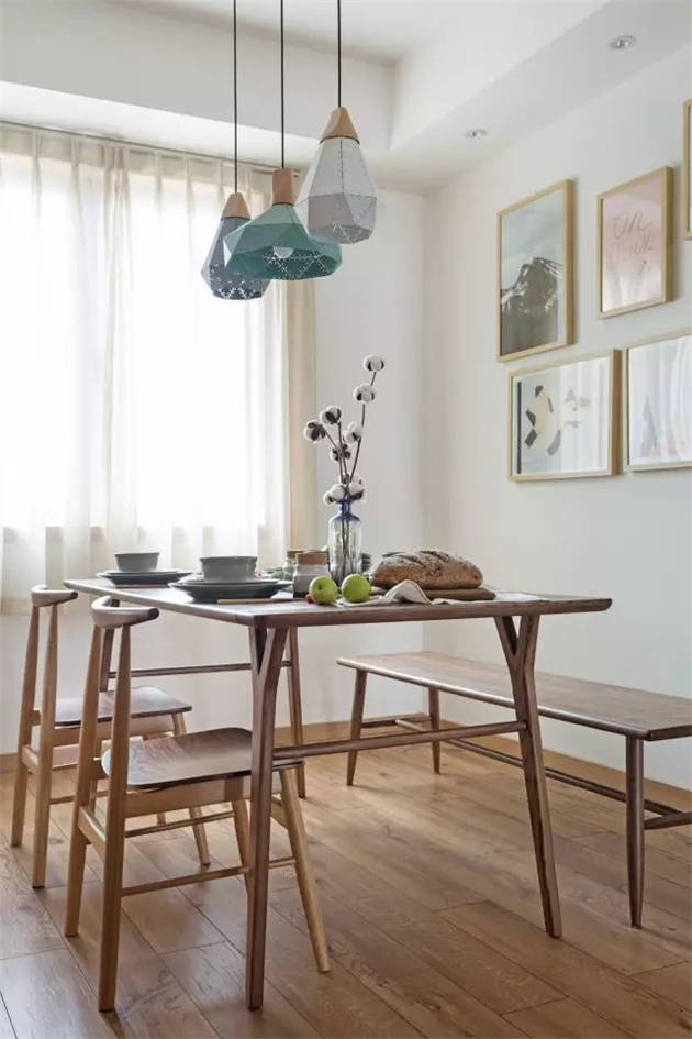 別致的原木桌椅提升整個(gè)空間的質(zhì)感。薄荷綠和淺藍(lán)綠的吊燈,讓人眼前一亮。