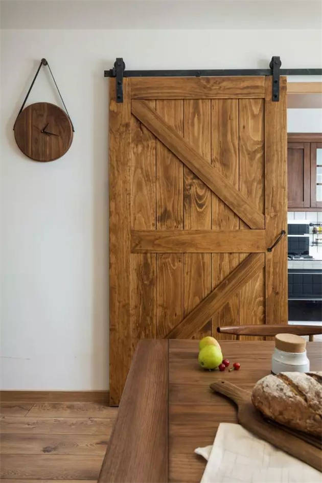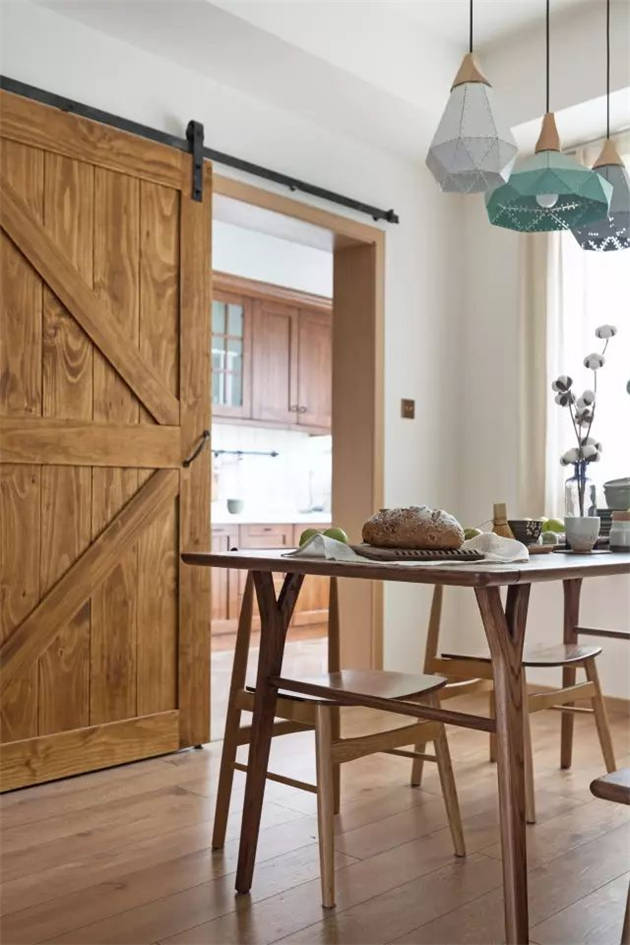 原木色谷倉(cāng)門與地板和桌椅相互呼應(yīng)。