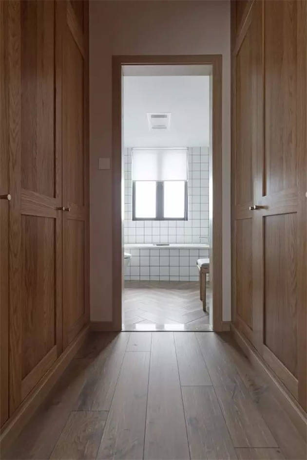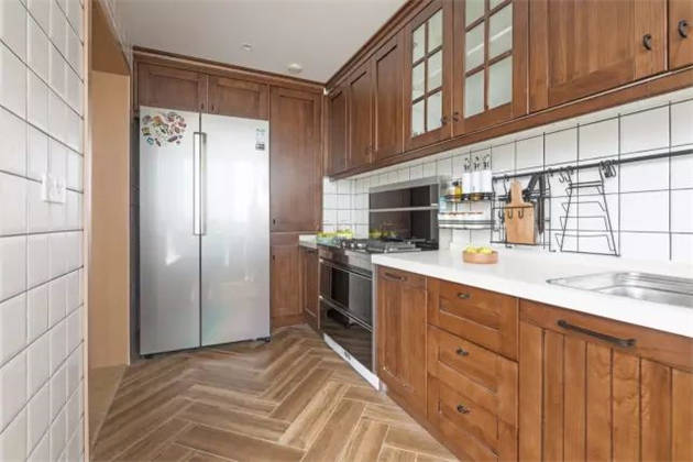 廚房木色的地磚和柜門配以白色的小方磚,讓整個(gè)空間沉穩(wěn)而不失清新。