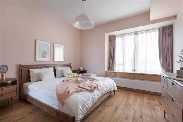 柔軟粉嫩的墻面配色搭配溫馨的木色地板,讓主臥空間煥發(fā)出別樣的清新浪漫。