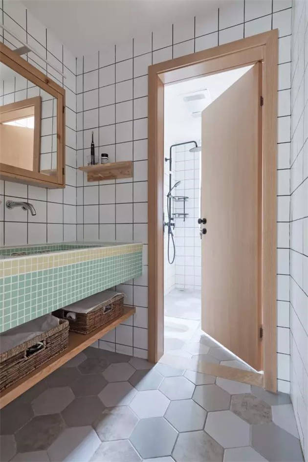 衛(wèi)生間進(jìn)行了干濕分區(qū),盥洗臺(tái)配以糖果色馬賽克瓷磚,清新明亮。