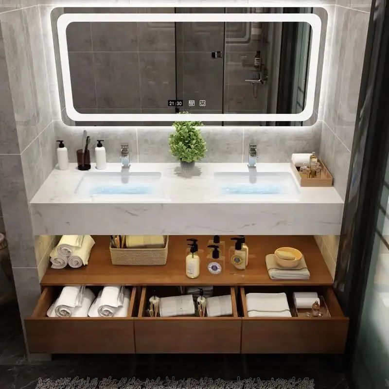 浴室柜的懸空最好做30cm,這樣浴室柜下面的空間也可以利用。擺放一些收納筐之類的特別方便,打掃的時(shí)候直接拿走就好了。