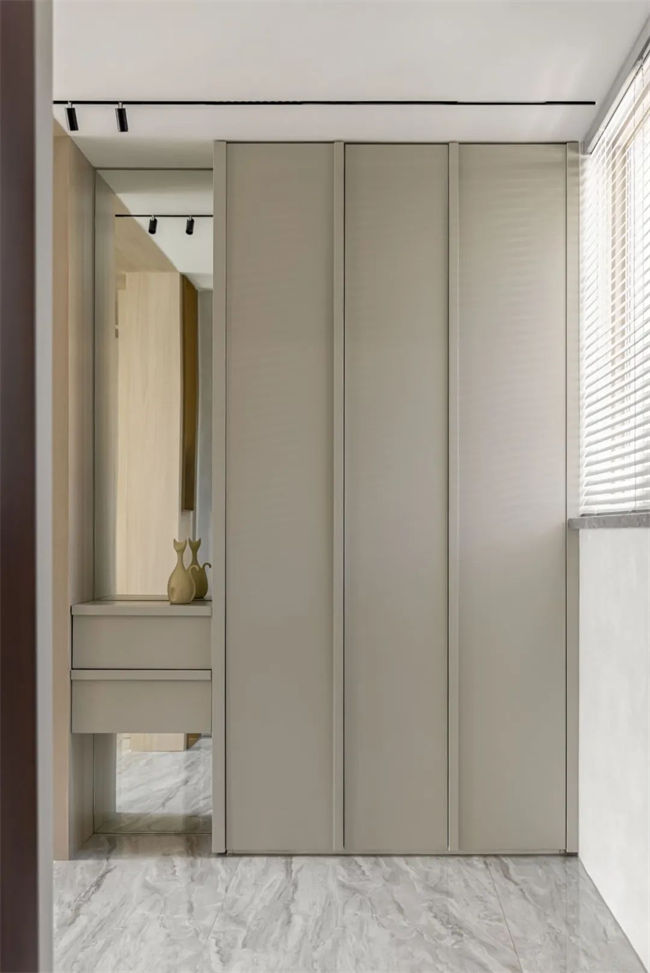 將玄關柜做成懸浮式設計,既保證了足夠的收納空間,下方懸空的區(qū)域還可以放置出入常穿的鞋子,清潔起來也很方便。加入隱藏式的燈帶設計,生活更有氛圍感。