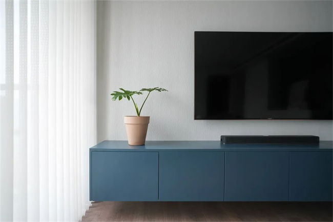 相比于常規(guī)的電視柜,懸浮設計的電視柜更加簡約大方。最常見的就是一字形柜,將插座、電線等隱藏在其中,將空間的高級感拉滿。