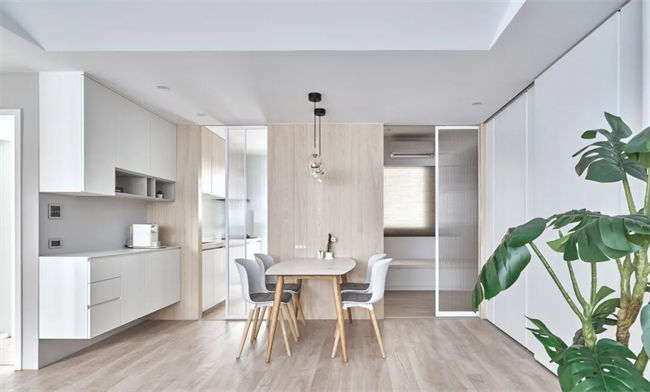 懸浮式設計的餐邊柜,空間占比更小,頂部做通頂設計,收納效果同樣很強大。沒有了遮擋,掃地機器人也能來去自如。