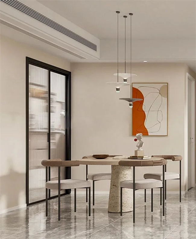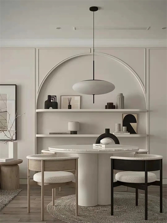 選擇內(nèi)嵌筒燈這種簡(jiǎn)潔又提升亮度的燈具,讓天花板盡可能的簡(jiǎn)單,空間會(huì)顯得更透亮。如果喜歡吊燈,一定要避開那些十分復(fù)雜的款式,吊燈的位置要在桌面上方290cm處,這樣才能發(fā)揮其特性,讓人感覺天花板更加遙遠(yuǎn)。