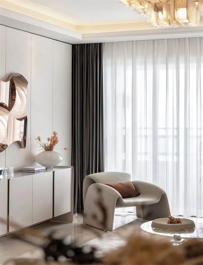 和穿大長(zhǎng)裙顯個(gè)高是一個(gè)道理,窗簾掛得越高,越顯層高,因此無論窗戶有多大,都可以把窗簾換成大號(hào)的,最好從頂?shù)降?,讓修長(zhǎng)的窗簾拉伸視覺效果,拔高空間層高。