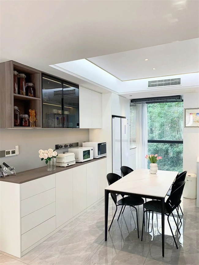 3、若空間較大可以將電器柜餐邊柜合二為一,還可以將冰箱放置在此,分擔(dān)廚房的收納壓力。