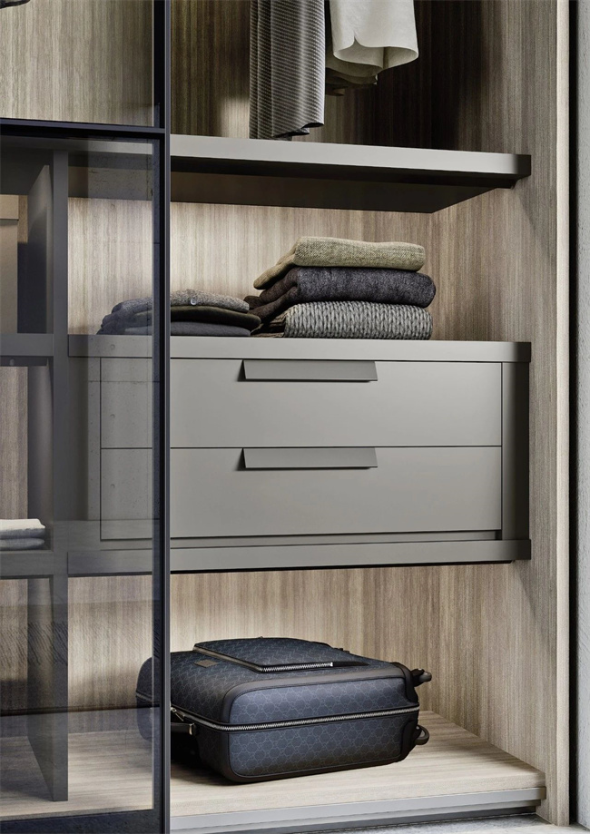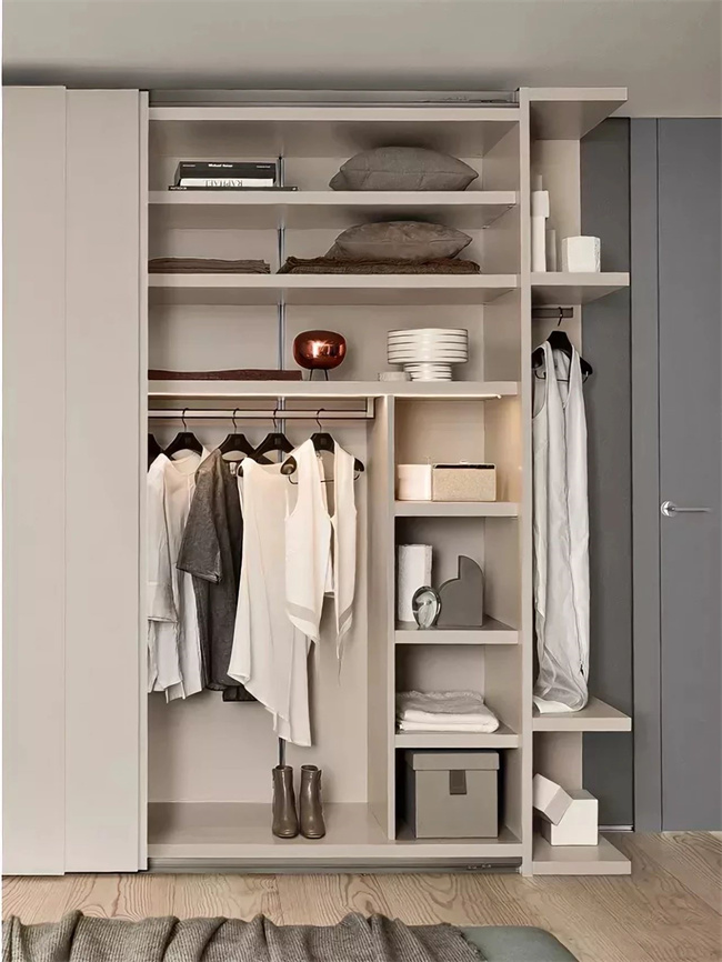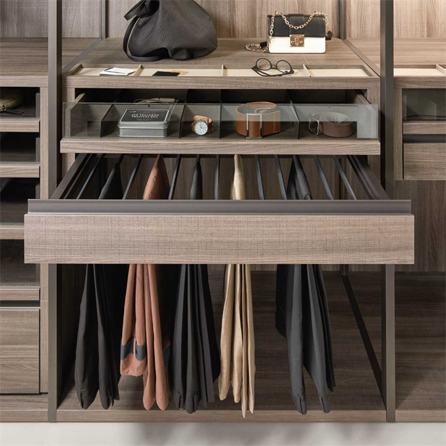 在衣柜分好掛衣區(qū)、疊放區(qū)、抽屜區(qū),根據(jù)不同的分區(qū)存放不同長短、類型的衣物,再安裝功能五金抽屜件,用來收納各種小飾品,拿取更便捷,歸位也更方便。