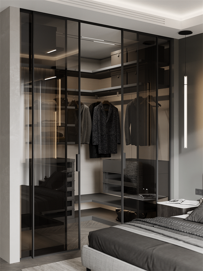 要想找衣服更方便,還有個(gè)方法就是做個(gè)玻璃柜門,它能讓你對(duì)衣柜內(nèi)部的分區(qū)一目了然,直接拿取想要的衣物,還能增加空間的層次感,讓臥室看起來更寬敞亮堂。