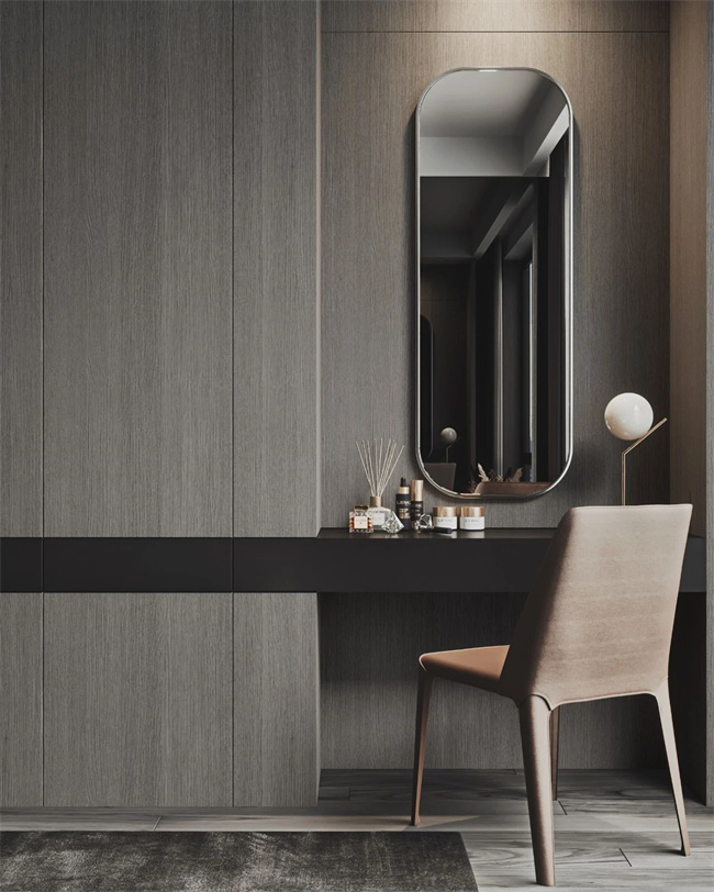 除了最基本的儲(chǔ)物功能外,還可以定制一個(gè)內(nèi)嵌式化妝臺(tái),用來收納各種化妝品、護(hù)膚品,把常用的物品都放這里,頻繁拿取也非常便利,而且還不占地方。