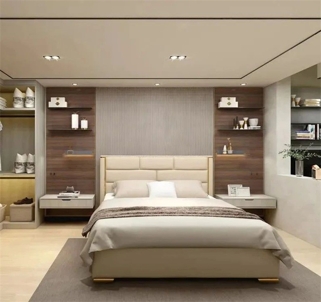 嵌入式床頭把柜子和床頭相連,上方再打一排柜子,整個(gè)空間就被利用起來了。不過要注意的是,設(shè)計(jì)的時(shí)候要保證床頭顏色和柜子顏色的統(tǒng)一。