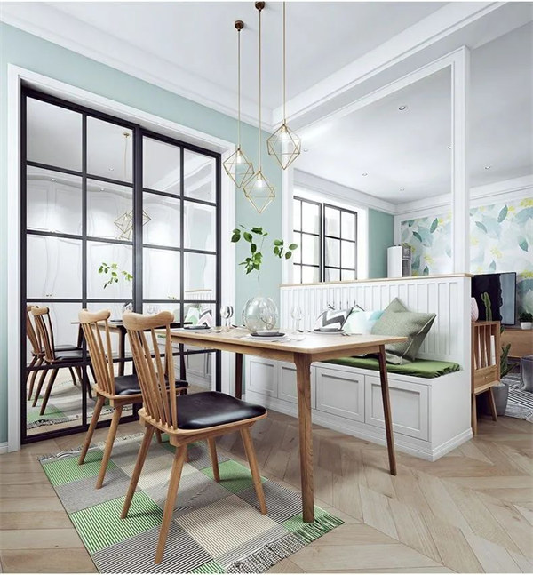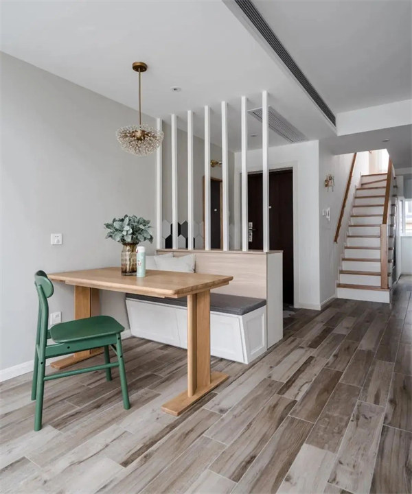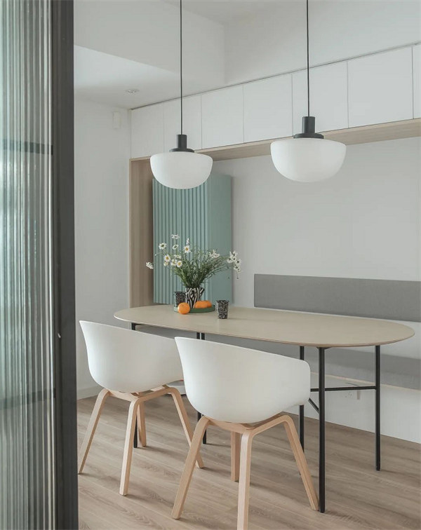 小戶型設(shè)計往往因為擁擠給我造成壓抑的視覺感,卡座隔斷既能劃分空間,同時還不會遮擋光線,在起到隔斷空間作用的同時,還能多出一個餐桌位置。配合吊燈以及桌面上的綠植,可以營造滿滿的生活儀式感。