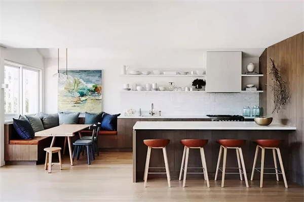 開放式廚房中,卡座與酒柜、餐邊柜等進行一體化設(shè)計,可以增加更多的實用功能,彌補操作空間不足的問題,同時豐富空間的層次感,大大提升家居格調(diào)。