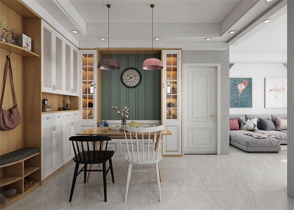 玄關(guān)設(shè)計為卡座組合柜形式,由鞋柜+卡座+衣柜組成,同時滿足多個功能需求,通過換鞋凳和儲物結(jié)合,既能充當收納,放得了鞋子,又能方便家里的老人、小孩換鞋,同時還能巧妙地與餐廳相結(jié)合,兼顧實用性與美觀性,視覺上更有層次感,使用也更便捷。