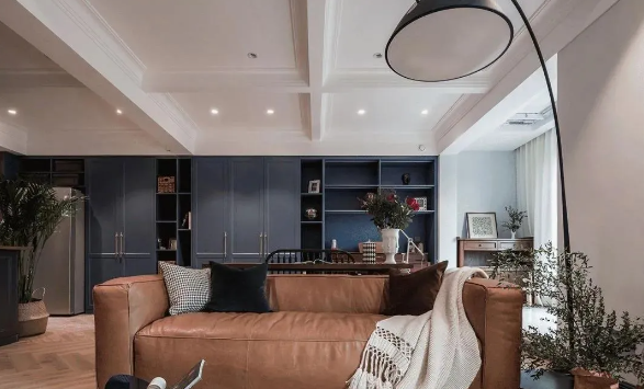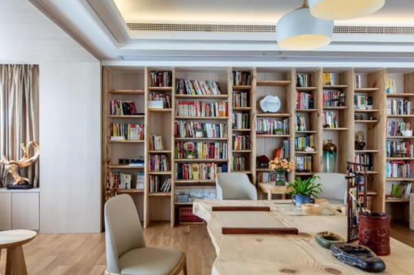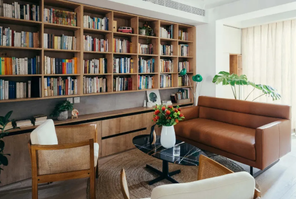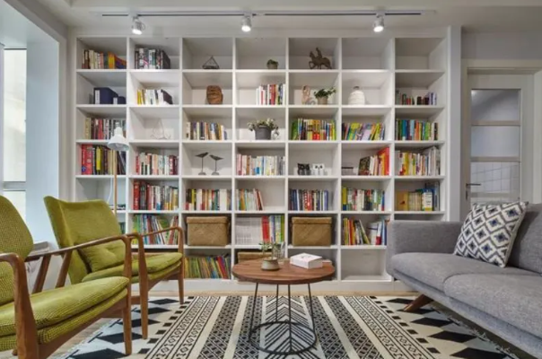 如果不是特別的藏書發(fā)燒友,客廳整面書柜完全可以兼具收納柜的功能。一半藏書,一半藏雜物。藏書的部分可以做出開放格或者玻璃門;而收納雜物的部分可以采用柜門遮擋。既美觀又實用。