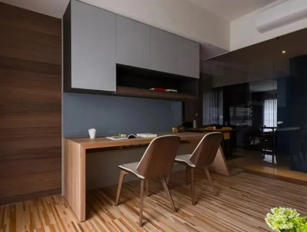 傳統(tǒng)的沙發(fā)布局,入座后面朝的是電視機(jī)。人和人雖然離得很近,但是卻缺乏溝通??蛷d書房一體化的設(shè)計,以書桌為空間核心。讓一家人有了更多面對面而坐的時間。想一想,你多久沒有和伴侶、孩子促膝長談了?!