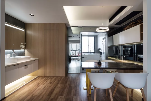 餐廳一側(cè)就是洗手盆,側(cè)邊的木飾面打造的墻體裝上一個隱形門,潔凈的洗手盆結(jié)合木質(zhì)感的空間,在燈光的修飾裝扮下,顯得充滿了精致的層次感,同時臨近餐廳的洗手盆,讓在餐前飯后都可以方便地洗手,養(yǎng)成良好的習(xí)慣。