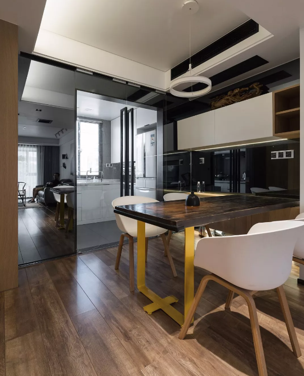 餐廳廚房之間的玻璃推門,與餐廳背景墻的黑色鋼化玻璃,還有一套現(xiàn)代舒適的餐桌椅,搭配顯得格外的現(xiàn)代時尚。