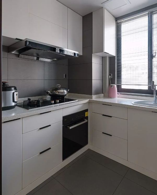 廚房以白色櫥柜門板,搭配黑色的電器,還有灰色的墻面磚,裝扮出一個現(xiàn)代時尚的空間感。