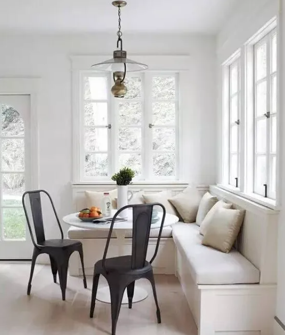很多小戶型的餐廳都小,放下一桌四椅后過道又變窄了,這時候選擇設(shè)計卡座最合適不過。