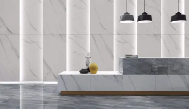 3、巖板vs普通瓷磚;普通瓷磚的成分是陶土、黏土等材料胚體呈黃色,湊近一點看可以看見雜質(zhì)。側(cè)面能看到釉層和胚體明顯的分層,是模具成型的工藝,背面上都有不同的模具紋理,燒制溫度在700°C左右。巖板的成分是二氧化硅、無機黏土天然石料,巖板的尺寸在1.2mx2.4m以上,胚體是白色的,很干凈,沒有雜質(zhì)的,側(cè)面通體不分層,巖板是滾壓成型的工藝,背面是平的,大多都是偏白色。,燒制溫度在1200°C以上。