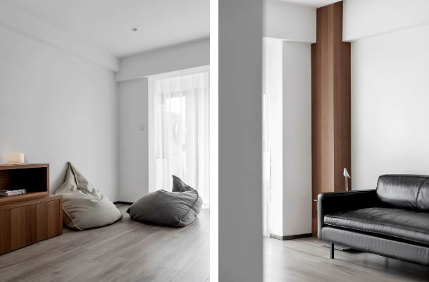 簡約、自由、互動是整個空間的主旋律,整體房間用了白色墻面,進門玄關(guān)的水泥漆將白色的墻面拉開距離。取消電視,電視墻留白,隨時可以變成家庭影院的投影墻