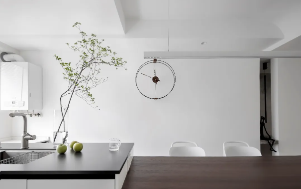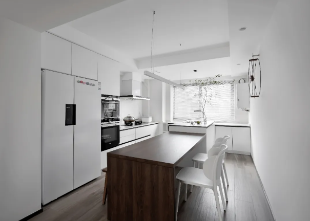 餐桌與島臺相鄰擺放,各司其職,又相互補充。胡桃木餐桌自然優(yōu)雅,也為這個黑白灰現(xiàn)代簡約空間增添了一些家的溫馨感