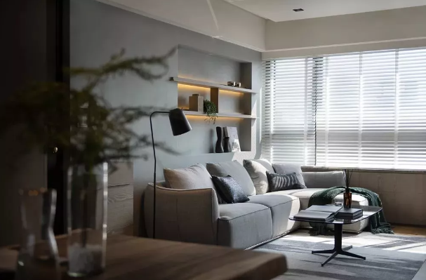 ▲L形布藝沙發(fā)挨著窗戶布置,窗戶裝上百葉簾窗簾,整個空間淡雅明亮的空間,充滿了輕松自然的氛圍感,而沙發(fā)墻上的格板架擺著精致的小飾品,顯得溫馨而與層次感。