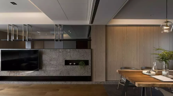 ▲電視墻大理石質(zhì)感,頂部是留空、側(cè)邊這是木飾面,在大理石中間留出一個黑色壁洞,擺上銀色擺飾與一盆小綠植,顯得清新檔次好精致。