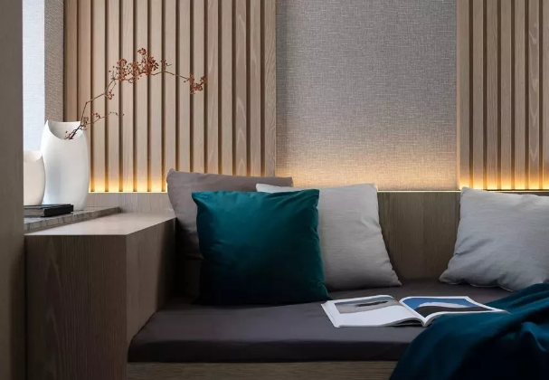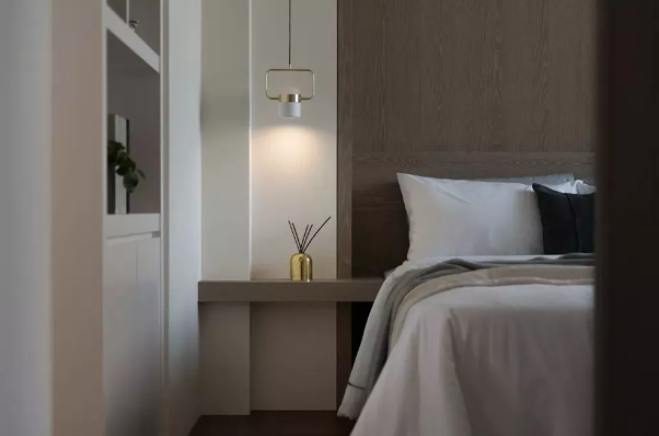 ▲木飾面的床頭背景,加入了一個格板床頭柜與床頭背景墻造型結(jié)合一體,營造出簡潔優(yōu)雅的統(tǒng)一設(shè)計效果。