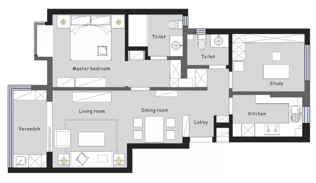 本案設(shè)計(jì)是以簡(jiǎn)約為主,選購的家具與配飾以簡(jiǎn)潔的造型、完美的細(xì)節(jié),營造出時(shí)尚前衛(wèi)的感覺。色彩上以灰色為主色調(diào),與屋內(nèi)現(xiàn)有的顏色相匹配,使整體居室充滿了愜意、輕松的氛圍。