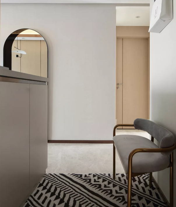 進(jìn)門的玄關(guān)左手邊是定制的鞋柜,灰色柜體搭配同色系石材臺(tái)面,含蓄低調(diào),充滿時(shí)尚感。地面灰色花紋地墊搭配金色腿換鞋凳,方便我們出行的同時(shí)又散發(fā)出了摩登氣息。右邊墻上安裝了3枚簡(jiǎn)約多功能的藍(lán)灰色掛鉤,像小豬一樣可愛萌趣,很好的融入墻壁又方便我們隨手掛包及小物。墻上鋪貼了灰色的墻布,使整體家居在色彩上柔和穩(wěn)重、和諧統(tǒng)一。
