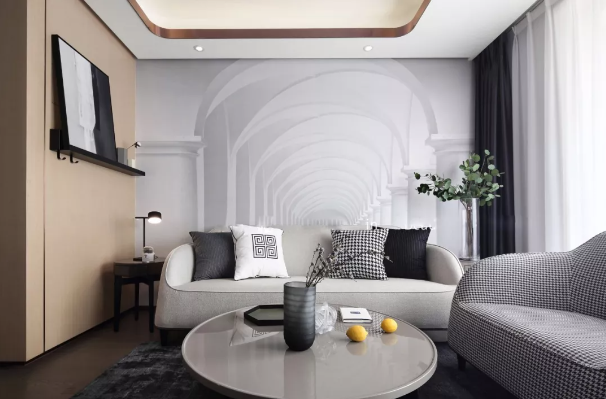 客廳的米白色三人沙發(fā)恬靜沉穩(wěn),百看不厭;搭上千鳥格的單人沙發(fā),極具藝術(shù)立體美感,整體感覺舒適,古樸自然。沙發(fā)背景墻定制了3D壁紙,在視覺上增加了空間的立體感。
