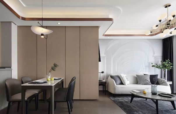 餐廳的吊燈精致小巧,造型獨(dú)特,黑白金的搭配增加了空間的時(shí)髦感。