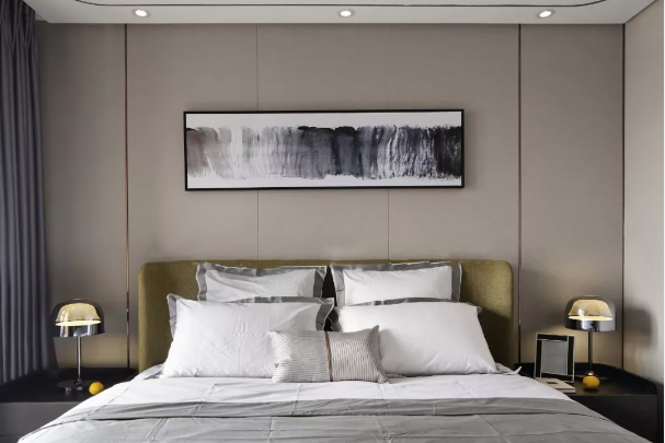 在以灰色調(diào)為主的臥室里配上橄欖綠的大床,可以緩解空間的單調(diào)乏味,同時(shí)提升質(zhì)感,在清新之余還讓人感覺到暖意,寧靜的氣氛很助眠,也讓人驚嘆高級(jí)。床頭上的裝飾畫名叫“暈染”,寥寥數(shù)筆丹青染在白宣之上,給空間帶來簡(jiǎn)逸恬淡的意境。