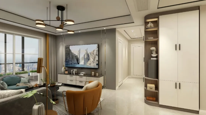 客廳背景墻的設(shè)計(jì)尤為精彩,通過(guò)護(hù)墻板與藝術(shù)畫的交錯(cuò)搭配,形成了豐富的層次變化,電視墻更是采用了標(biāo)準(zhǔn)的懸掛設(shè)計(jì),并配置有吊頂燈光,夜晚時(shí)分燈光傾瀉而出,瞬間提升整個(gè)空間的藝術(shù)氛圍。電視墻下方還設(shè)置了配套電視機(jī)柜,進(jìn)一步強(qiáng)化了空間上的立體感。