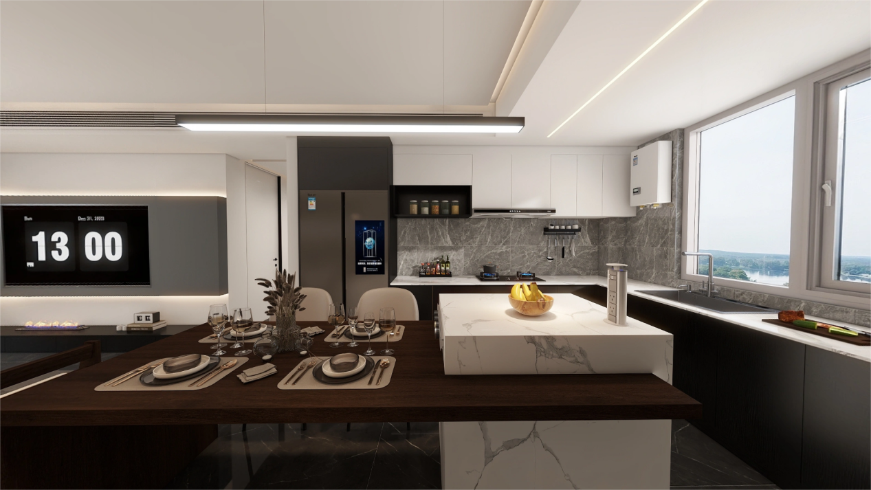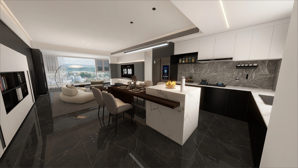 廚房與餐廳之間打通不做任何隔斷,餐桌的深紅色巧妙打破了黑白的單調(diào),為空間注入一抹鮮亮的色彩。廚房內(nèi),大理石紋墻面與地磚彼此呼應(yīng),營造出高級而溫馨的氛圍。餐桌上方,吊燈低垂,點(diǎn)亮了晚餐時光,也悄然詮釋著現(xiàn)代極簡風(fēng)的個性化與現(xiàn)代感。