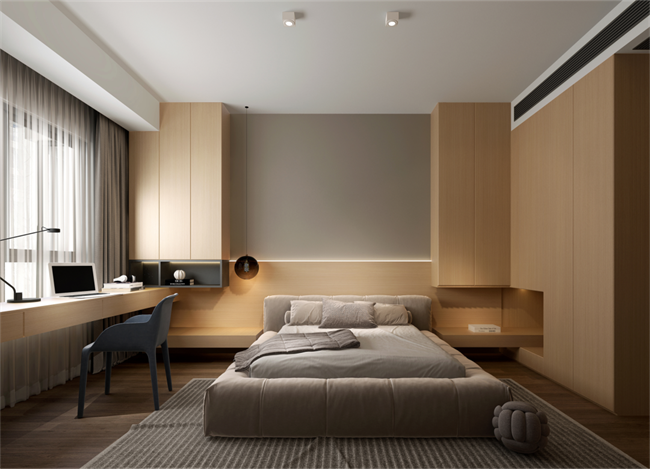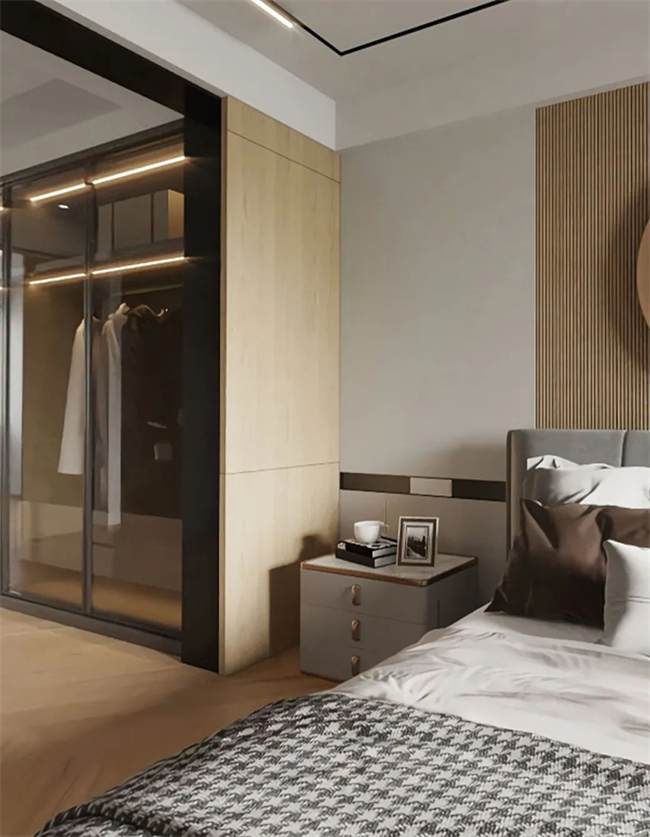 3、衣柜做成立體式到頂?shù)臉邮?。不易落灰,更好打理柜門盡量不要用透明玻璃的,如果衣服太多從外面看起來就會很凌亂,影響美觀。