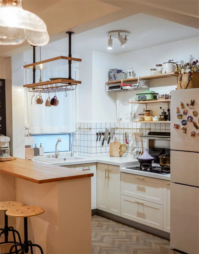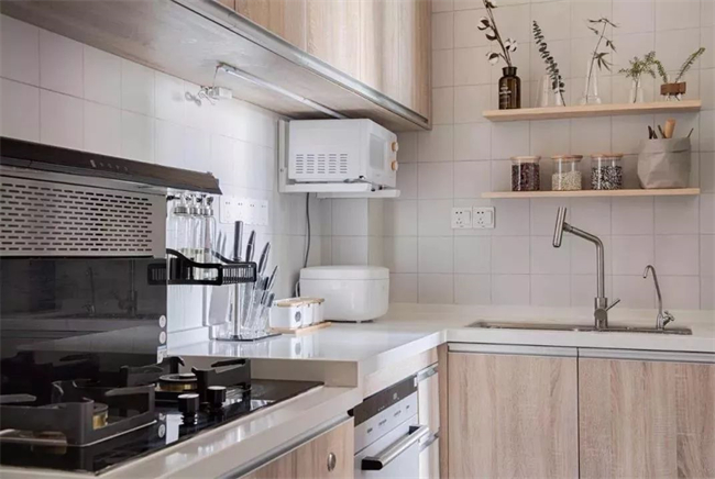 2、煙道處不做矮柜,改做高柜,裝上玻璃柜門擴大儲物空間,廚房更整潔,更好打理。